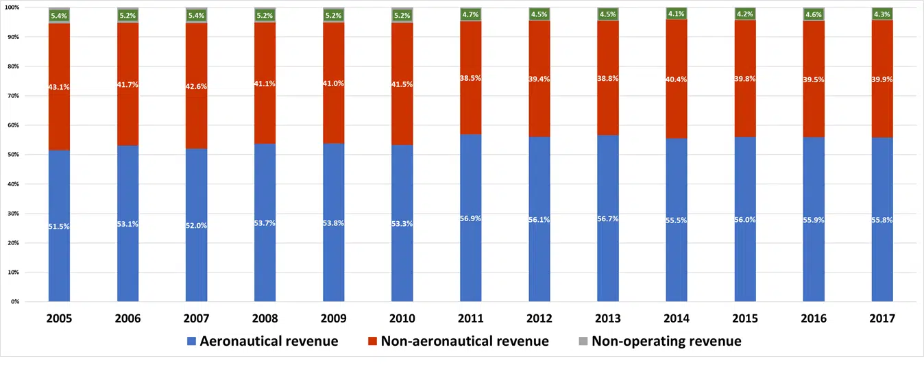 This is not to say that non-aeronautical activities are not growing. They are continuing to grow globally especially in some emerging markets, but their growth is not enough to surpass aeronautical revenues on a proportional basis. Based on data from ACI’s Airport Economics Survey (see Chart 1), it is worth underlining that non-aeronautical revenues (net of non-operating items) share was estimated at 43.1% in 2005 but went down to 39.9% in 2017.