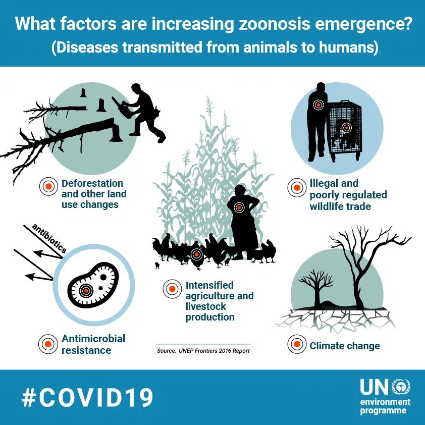 For instance, climate change is also been one of the contributing factors to diseases originating in vertebrate animals, and this has been exacerbated by illegal and poorly regulated wildlife trade.