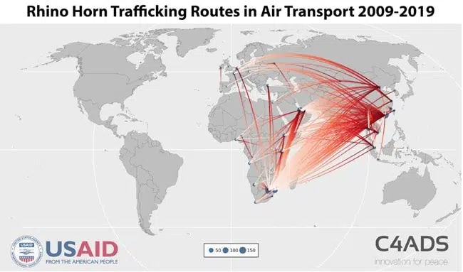 Most recently, in June 2019 authorities in Hanoi’s Noi Bai International Airport have intercepted 125kg of smuggled rhino horns worth US$7.5 million, or roughly US$60 thousand per kilo of smuggled horn. Similarly, in February 2019 authorities of Hong Kong International Airport seized US$1 million worth of rhino horn, in transit to Ho Chi Minh City from Johannesburg.